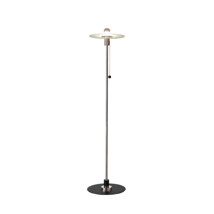 Mit 168 cm Höhe und einem 40 cm Sockel steht die Leuchte ausgewogen und tritt zugleich schlank auf. Die Materialkombination Nickel/Schwarz schafft eine präzise, grafische Wirkung, die sich sowohl in moderne als auch in klassische Interieurs integrieren lässt. Die satinierte Glasfläche schirmt die Lichtquelle ab und formt eine diffuse Lichtkuppe, die Konturen und Oberflächen im Umfeld angenehm zur Geltung bringt.